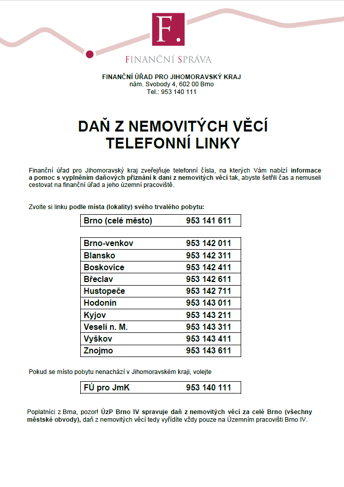 Finanční úřad pro Jihomoravský kraj zveřejňuje telefonní čísla, na kterých Vám nabízí informace a pomoc s vyplněním daňových přiznání k dani z nemovitých věcí tak, abyste šetřili čas a nemuseli cestovat na finanční úřad a jeho územní pracoviště.