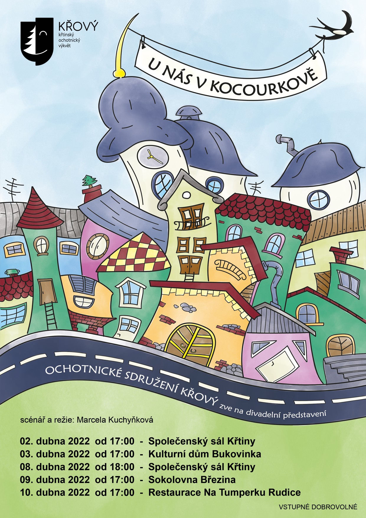 Zveme Vás na představení nové divadelní hry „U nás v Kocourkově“ ochotnického sdružení KŘOVÝ, které se bude hrát v naší sokolovně v sobotu 9. dubna 2022 v 17,00. Vstupné je tradičně dobrovolné.