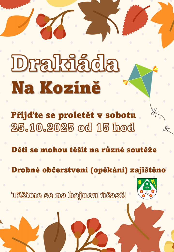 Obec Březina ve spolupráci s LMŠ Dobroděj zve na Drakiádu Na Kozíně. Přijďte se proletět v sobotu 25. 10. 2025 od 15 hodin 🐉. Drobné občerstvení zajištěno.