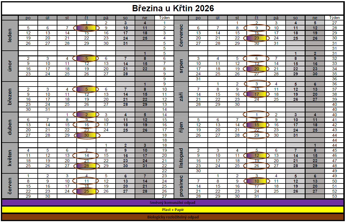 📅♻️ Zveřejňujeme kalendář svozu odpadů na rok 2026. Kalendář pokračuje ve stejné podobě, jako byl kalendář od jeho změny na podzim roku 2025. Svozovými dny zůstávají čtvrtky. Kalendář je v tištěné podobně možné vyzvednout v obchodě nebo na obecním úřadě.Kalendář svozu odpadů na rok 2026 (ke stažení v PDF)