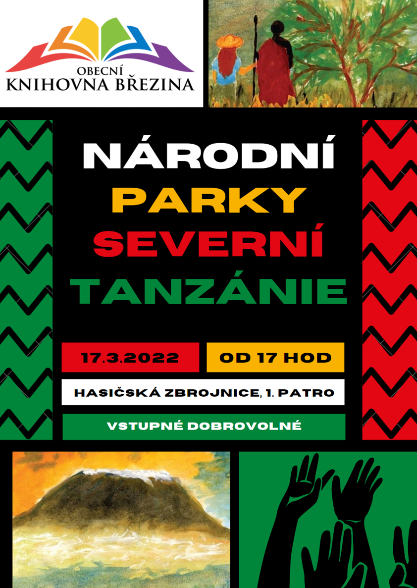 Obecní knihovna Březina vás zve na přednášku Národní parky severní Tanzánie, která se uskuteční ve čtvrtek 17. března 2022 od 17 hod na hasičské zbrojnici. Vstupné dobrovolné.