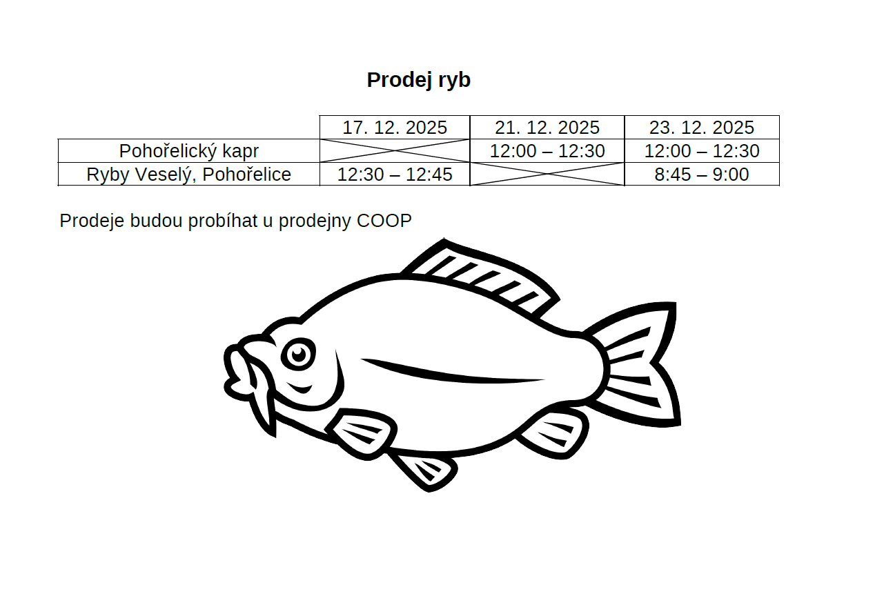 V předvánočním období k nám do obce přijedou dva prodejci ryb 🐟 Pohořelický kapr přijede 21. 12. a 23. 12. Ryby Veselý Pohořelice přijedou 17. 12. a 23. 12.
