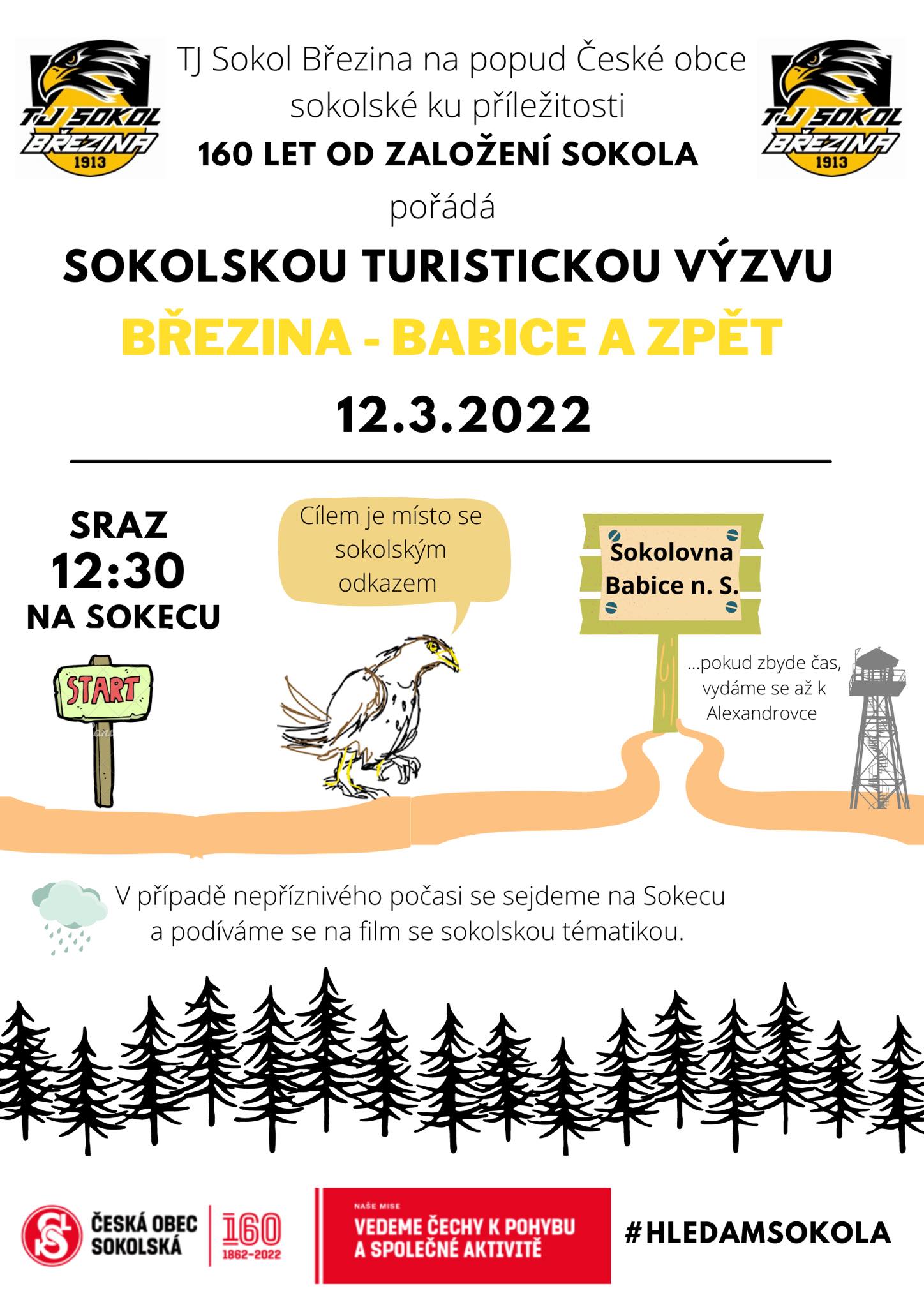 Zveme všechny občany na společnou procházku, kterou TJ Sokol Březina pořádá ku příležitosti 160. výročí od založení celostátní organizace. Půjdeme do Babic nad Svitavou, kde si prohlédneme místní sokolovnu a pokud zbyde ještě nějaký čas, projdeme se až k rozhledně Alexandrovka. Těším se na vás 12. března 2022 ve 12:30.