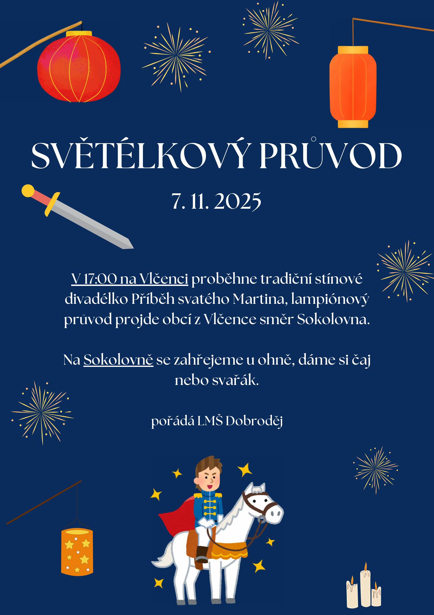 Pozvánka na Světélkový průvod, který v pátek 7. listopadu pořádá LMŠ Dobroděj . V 17 hodin proběhne na Vlčenci stínové divadélko a následně vyrazí průvod na Sokolovnu.
